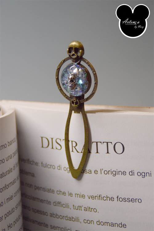 Segna libro in metallo, con tondo resinato ed avente un teschio che fuoriesce.